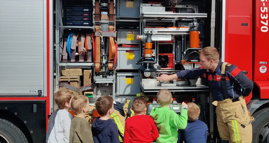 Na afloop konden de leerlingen per klas nog een kijkje nemen bij de brandweerwagens en even kletsen met de brandweermannen, als afsluiting van de geslaagde oefening.